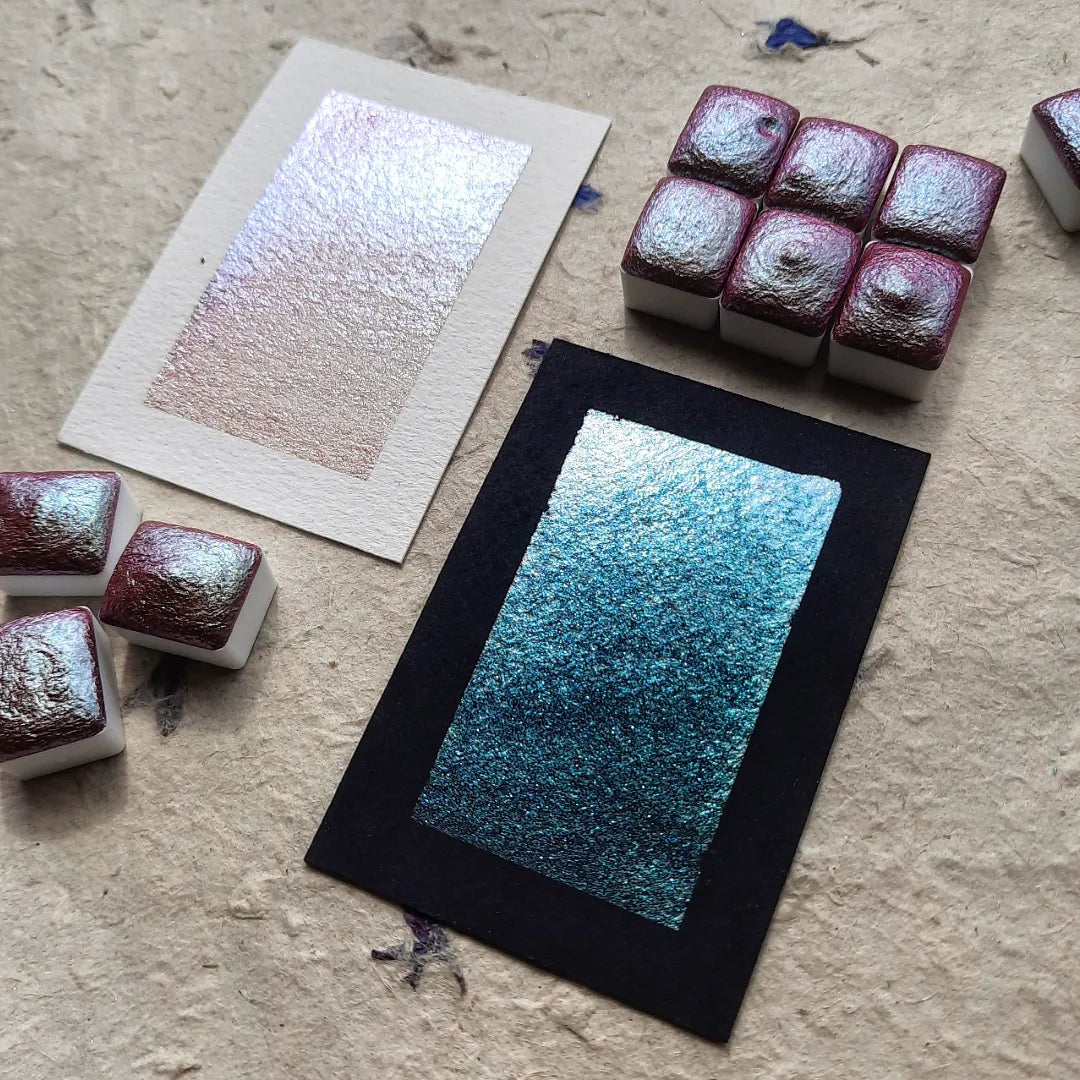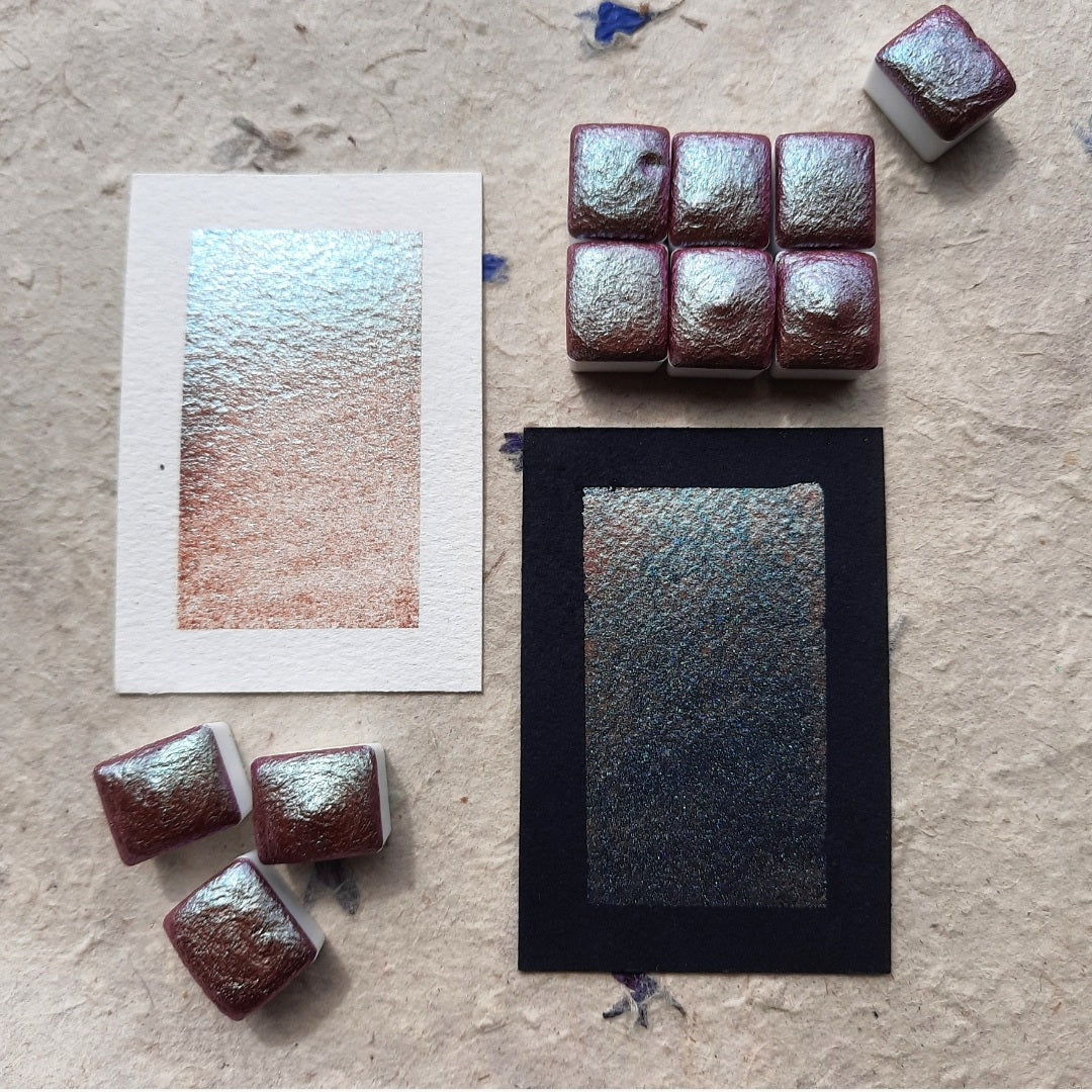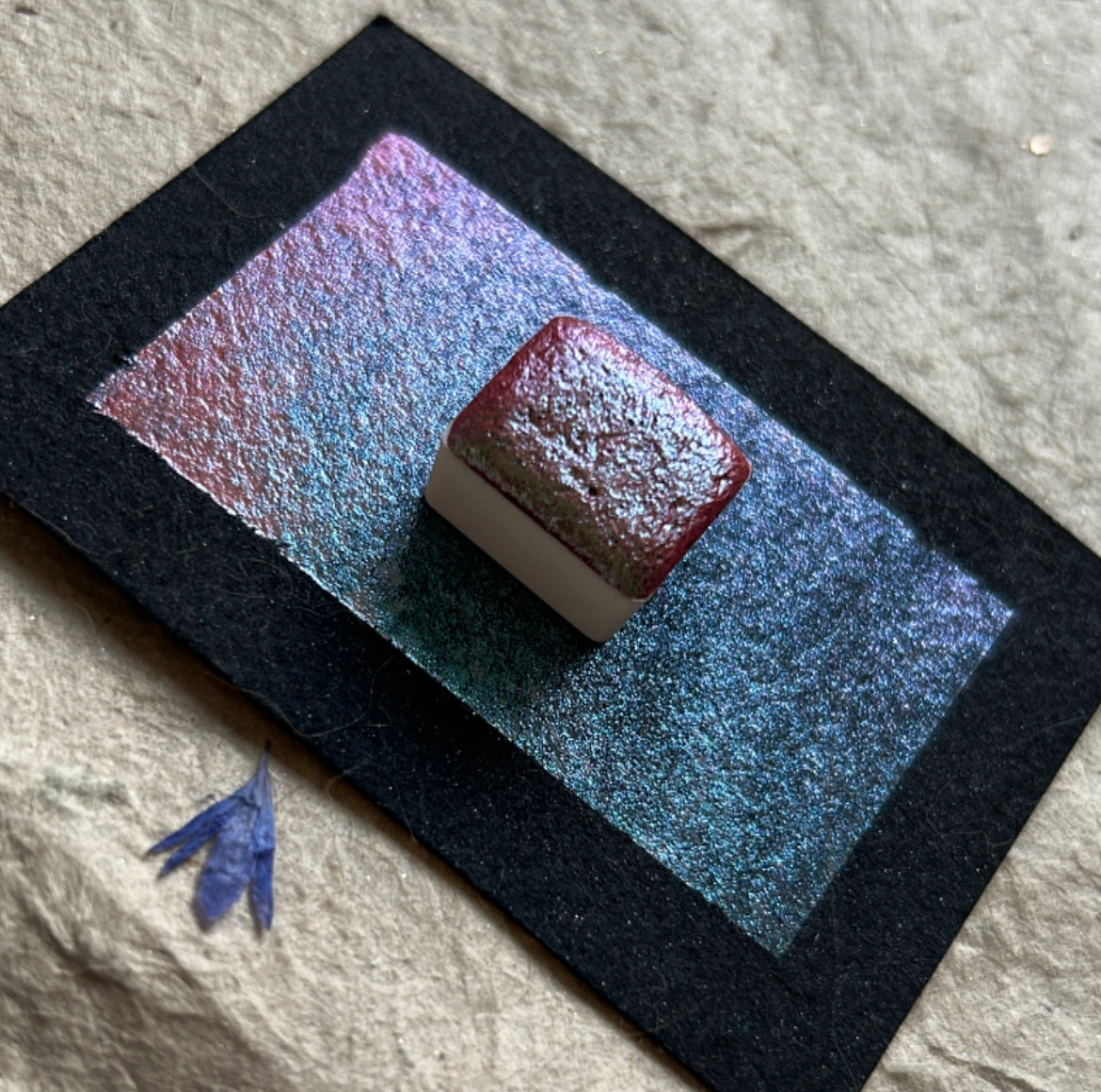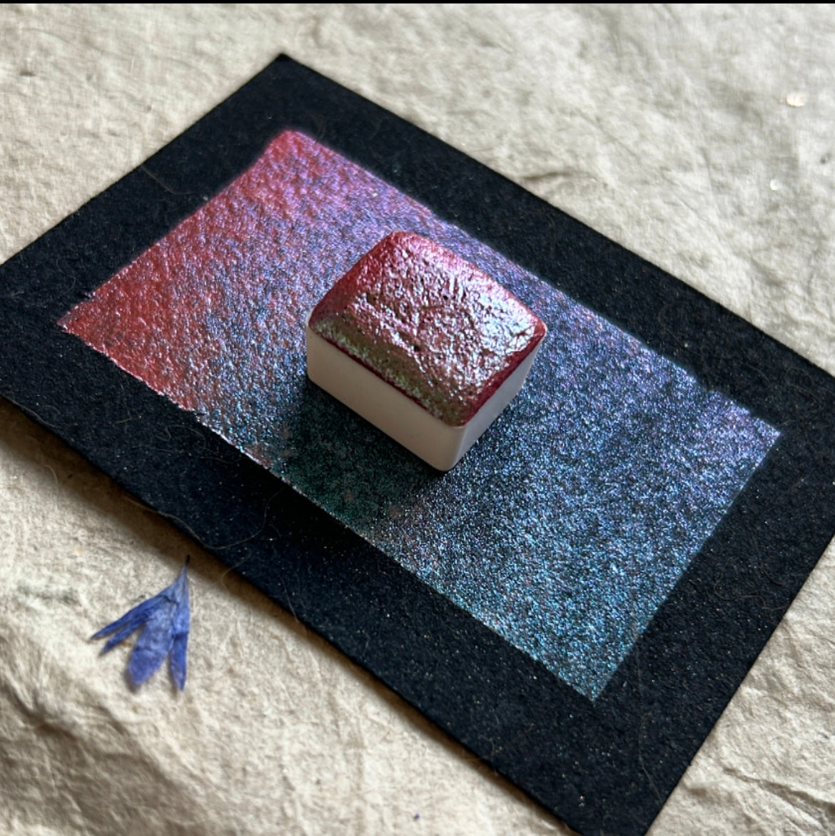 “Serpent Dreamer” is a colorshifing Pink/Green chameleon watercolour. The pigment for this colour is slightly larger, giving a "glitter” effect. The colour changes depending on the angle and lighting.