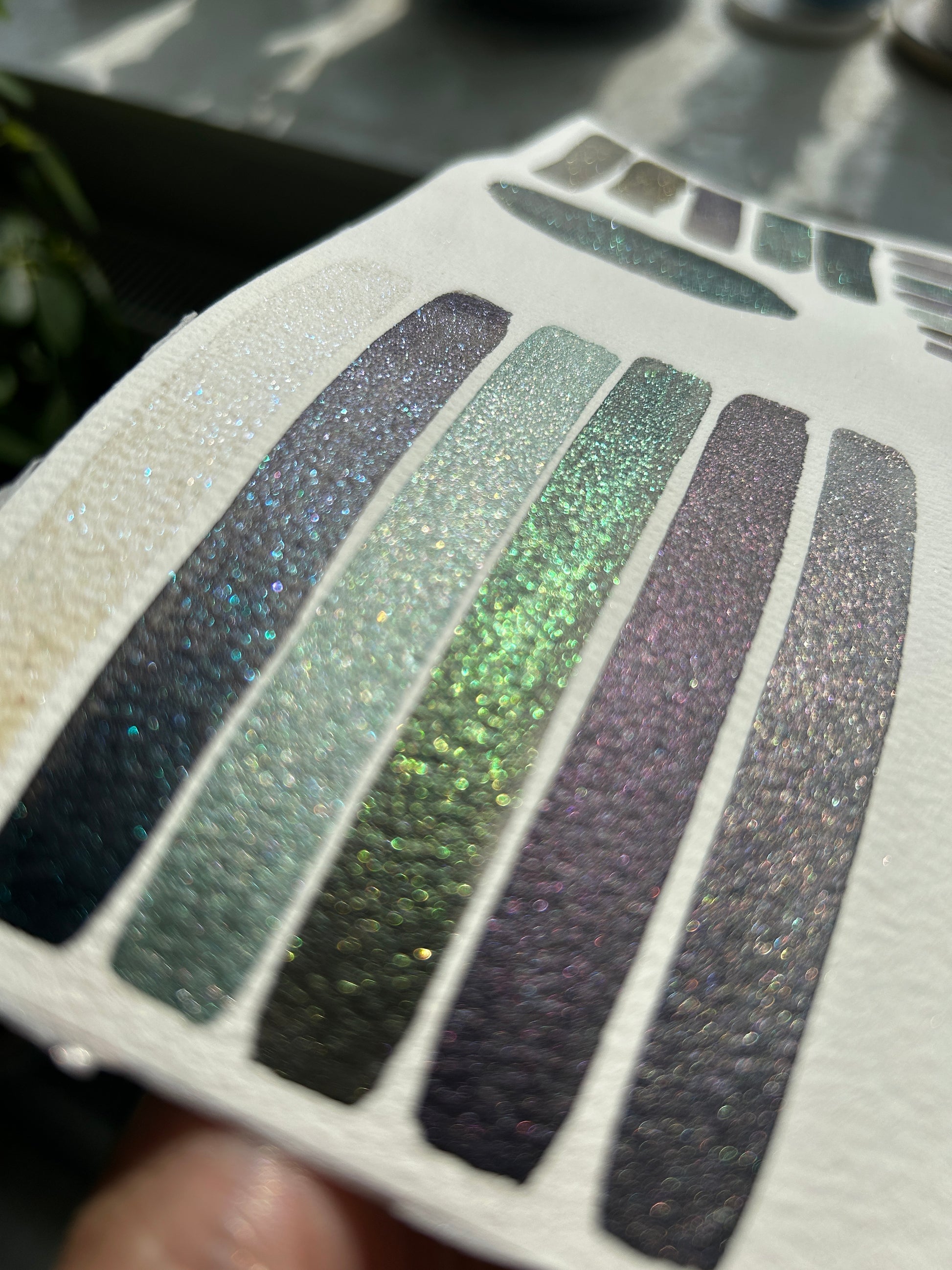 ✨The majority of swatches are made on 100% cotton paper and we do our best to represent the colour as closely as possible on the photos. It may appear different depending on your screen settings, the lighting/angle, the paper & brush that you use, the painting technique that you use.