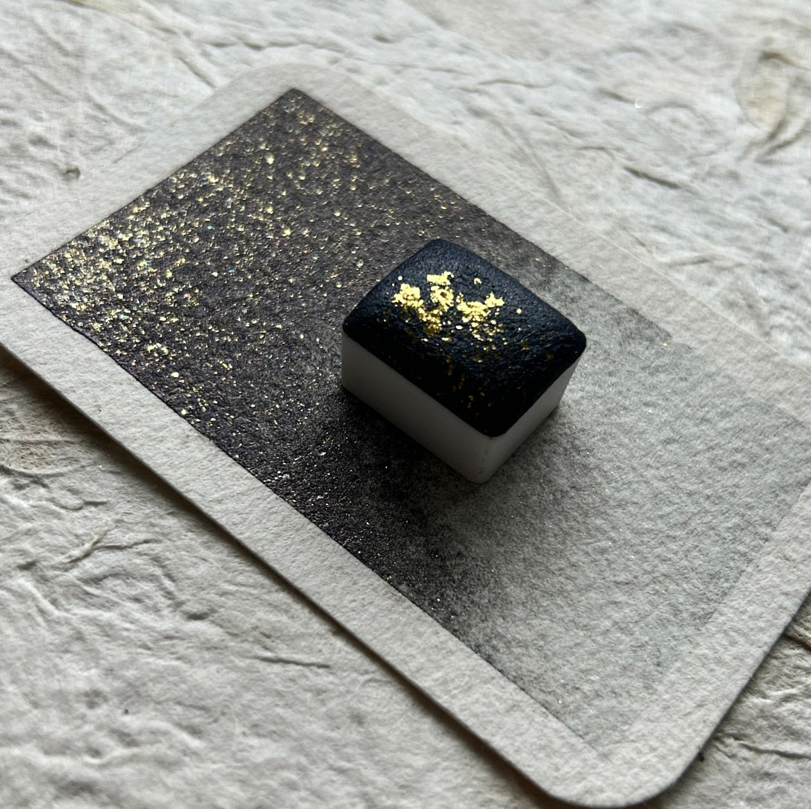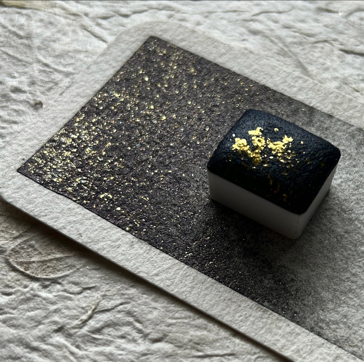 Fallen Stars : a beautiful black/dark grey mica watercolour packed with gold mica flecks and a slight blue undertone.