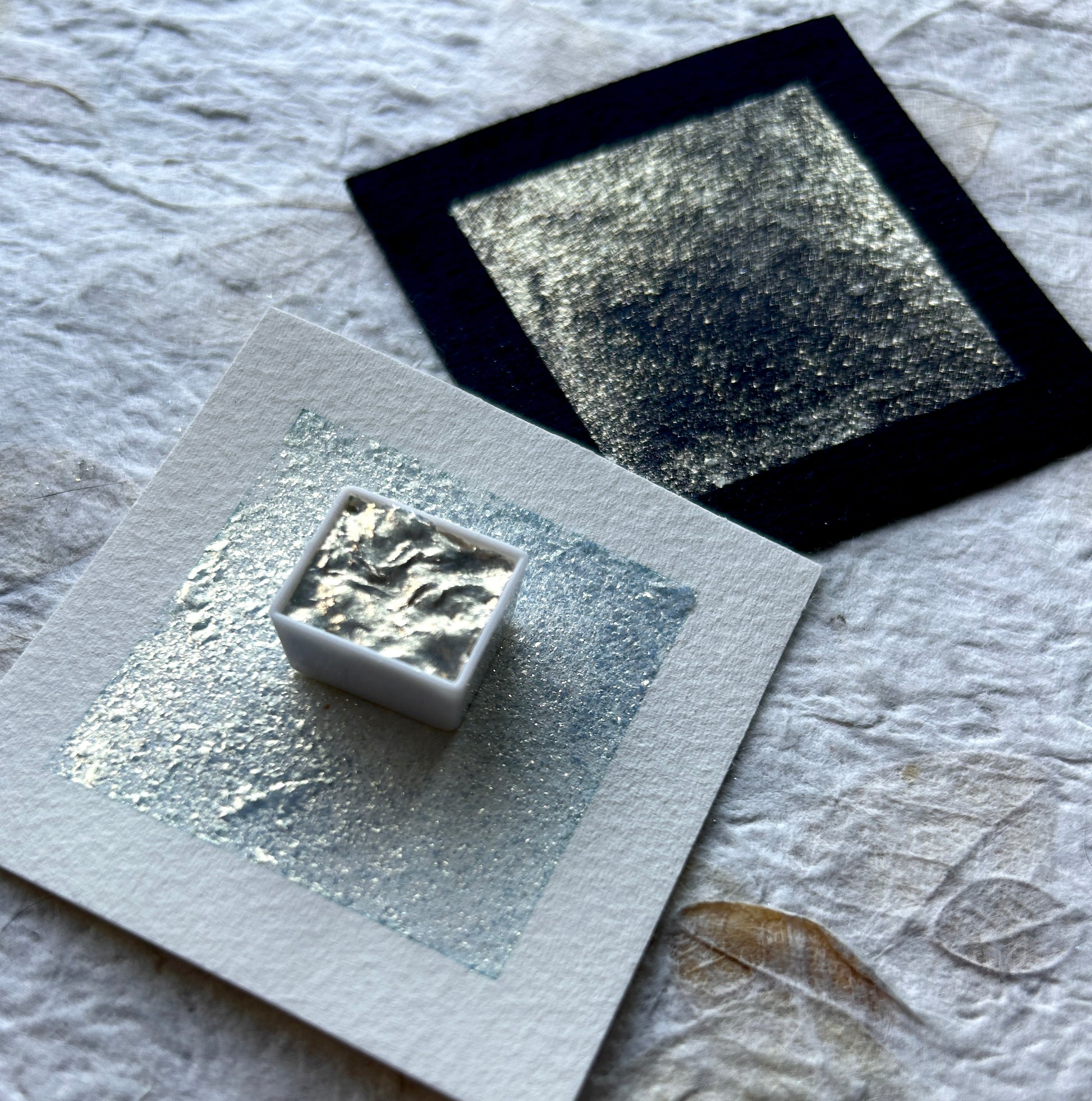"Starlight" - chunky synthetic mica flakes. This colour takes longer to reactivate. I suggest adding water to the pan and letting it sit for at least 1-2 minutes for best effect.