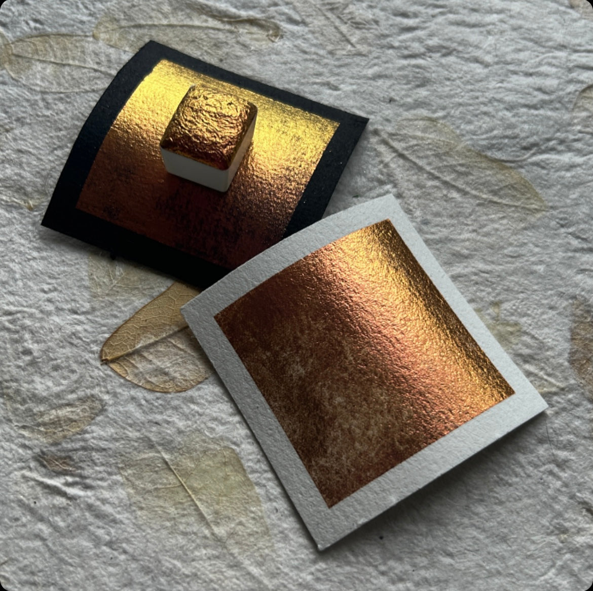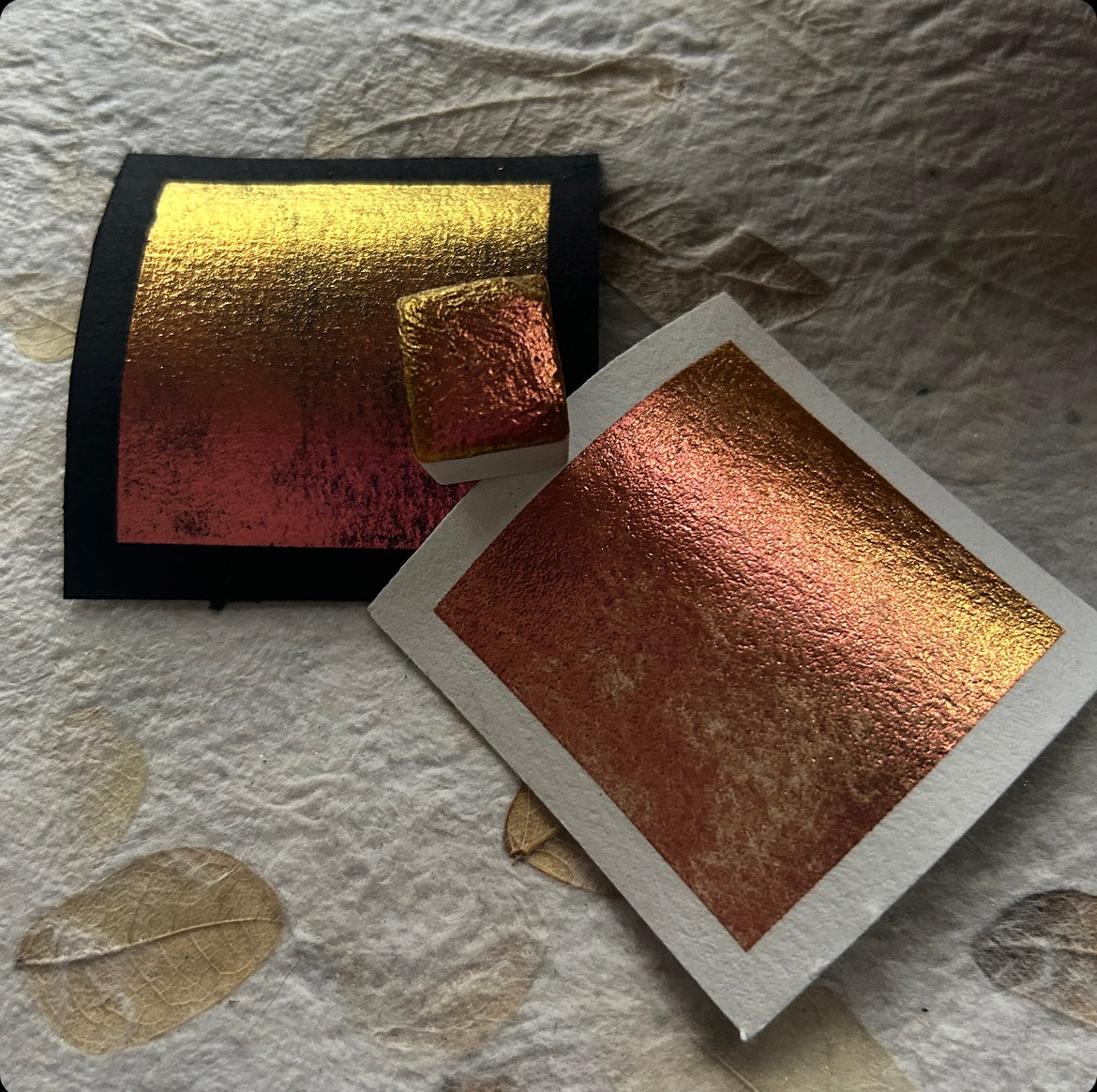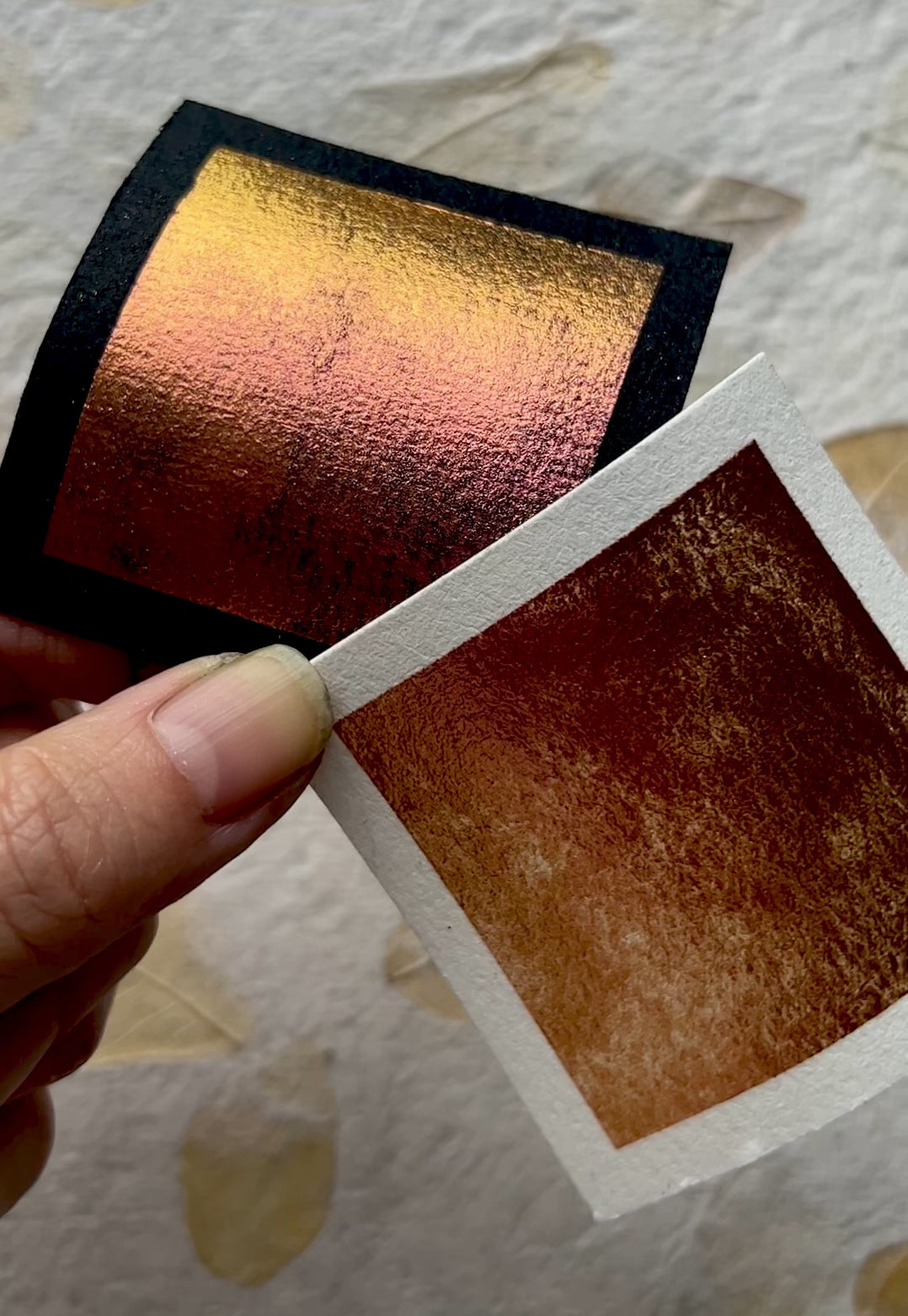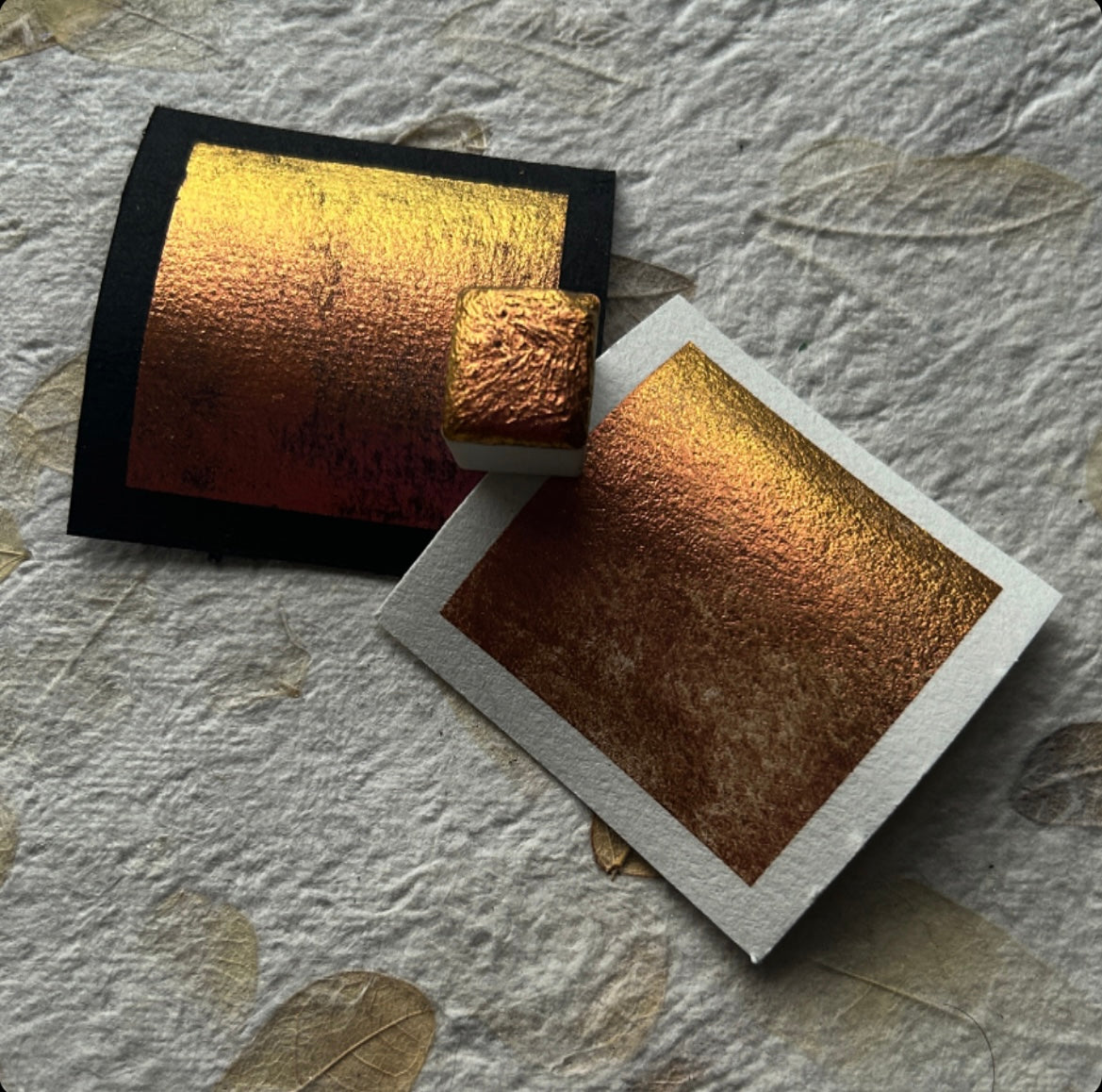 “Phoenix” is a colourshifing Orange/Red chameleon watercolour. The pigment for this colour is slightly larger, giving a “"glitter” effect. The colour changes depending on the angle and lighting. For the best effect, use on dark surfaces (Legion Black Aqua Stonehenge Paper in the photos)