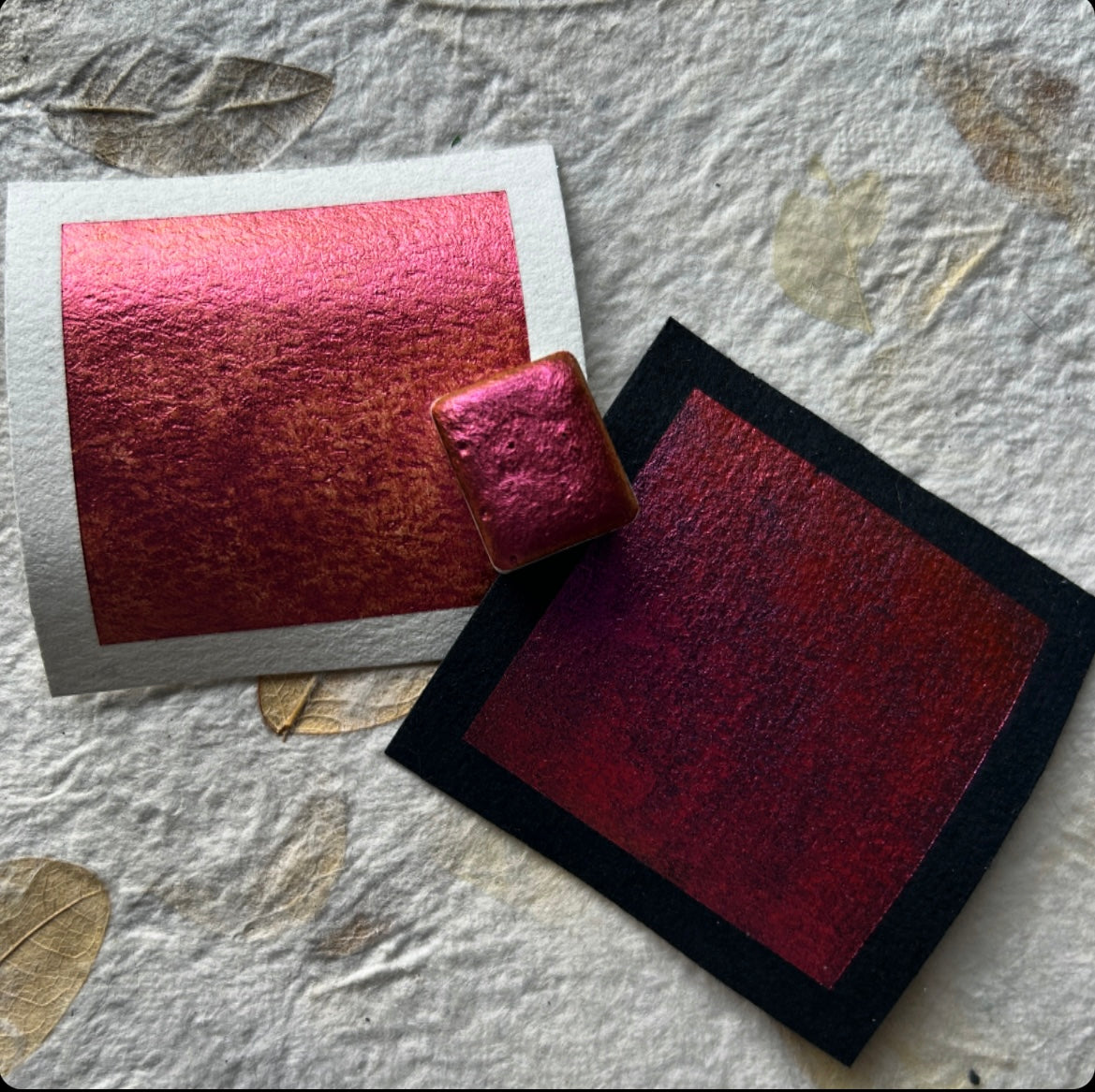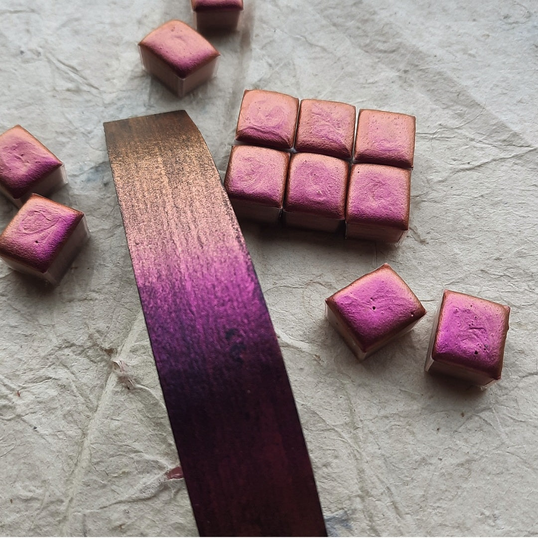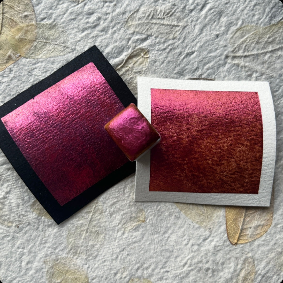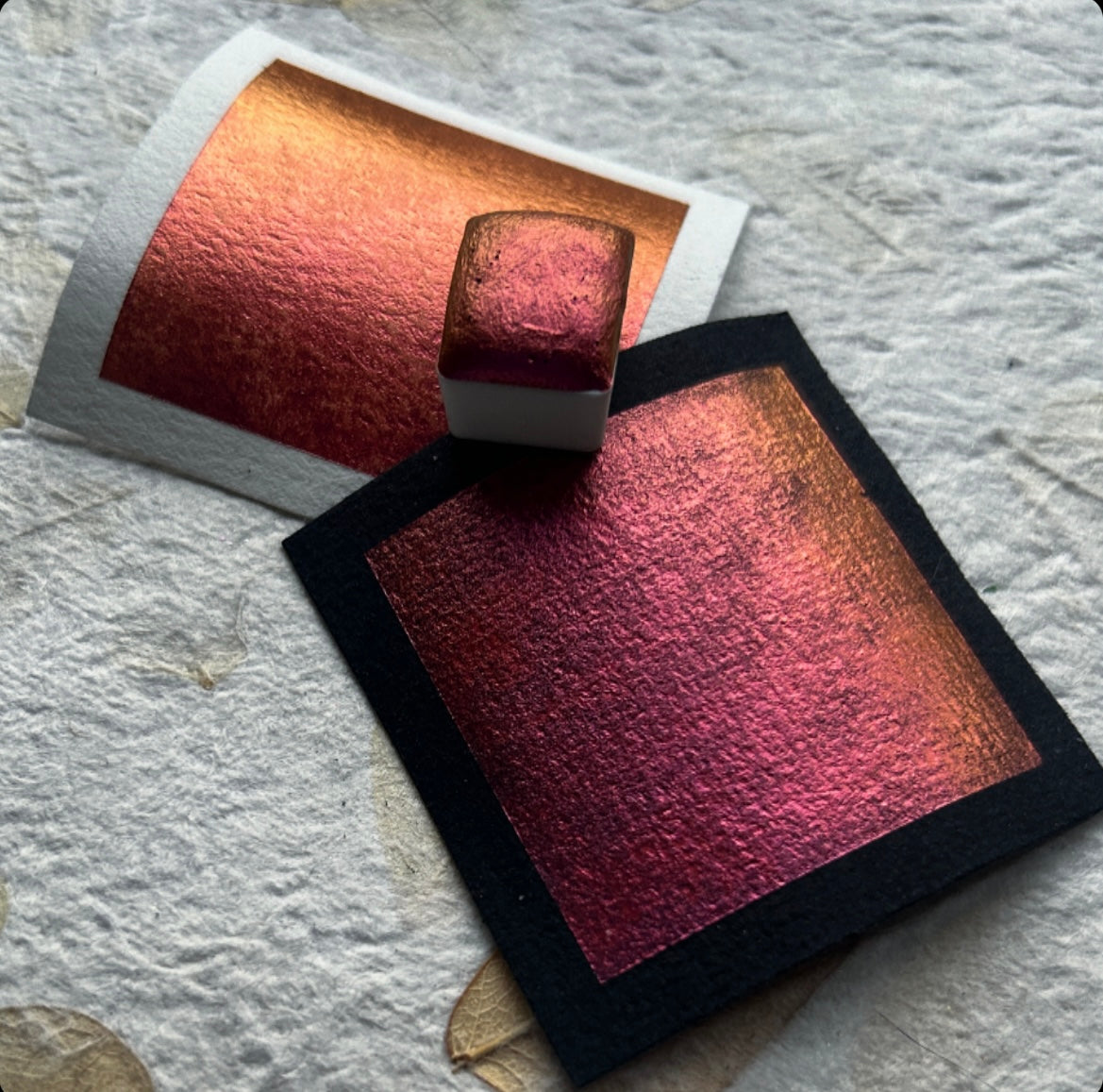 “Sunrise” is a colourshifing chameleon watercolour. The colour changes depending on the angle and lighting. For the best effect, use on dark surfaces.